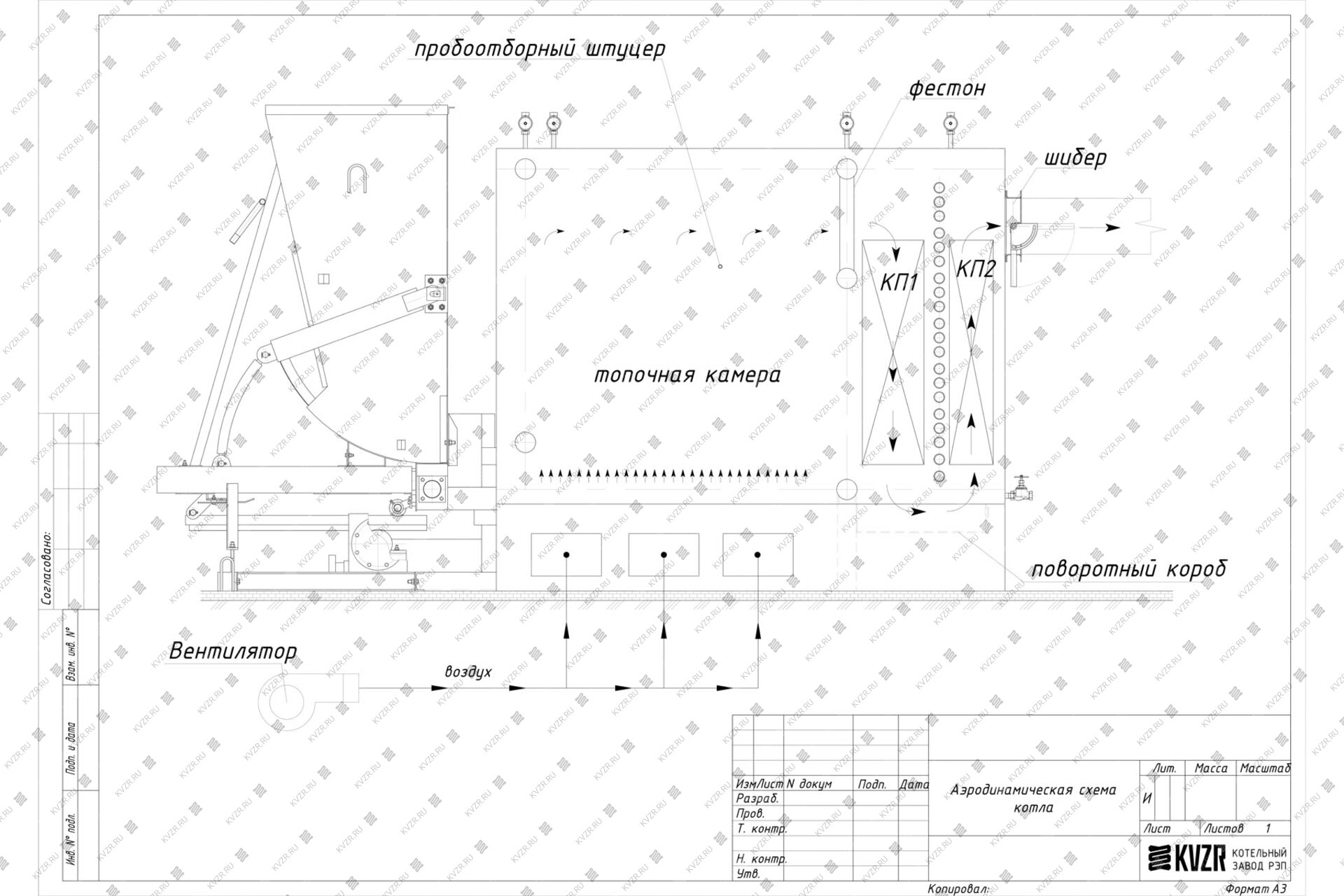 Автоматика котла по данным тягонапорометра производит контроль разряжения в топочной камере, блокируя работу вентилятора в случае снижения разряжения в топочной камере, и исключая выбивание дымовых газов из топки в котельный зал. Из топки дымовые газы поступают в первый конвективный пакет, разворачиваются в поворотном коробе и через второй конвективный пакет выходят в газоходы котельной.
