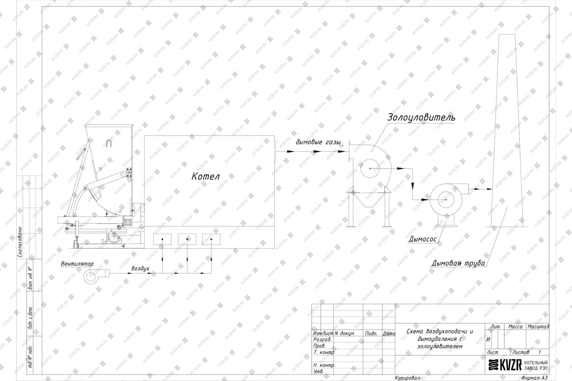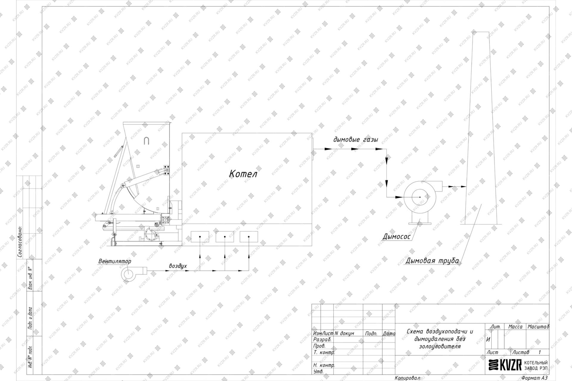 В случае, если степень очистки дымовых газов высокая не требуется, можно установить котел КВм-1.86 с ТШПМ без золоуловителя. Схема подключения при этом следующая - дымовые газы выходят из котла в газоходы котельной, затем в дымосос и далее снова по газоходам в дымовую трубу. В зависимости от компоновки котельной дымосос может устанавливаться как в котельной, так и на улице. Наш завод производит газоходы и переходники к ним. Получив схему вашей котельной мы можем изготовить для вас комплект газоходов, переходников нужных размеров и сечений. На месте такие детали собираются как конструктор. Обращаем ваше внимание, что газоходы требуют изоляции, для защиты персонала от ожогов, так как уходящие газы имеют высокую температуру, а на улице газоходы требуют изоляции для избежания образования конденсата.