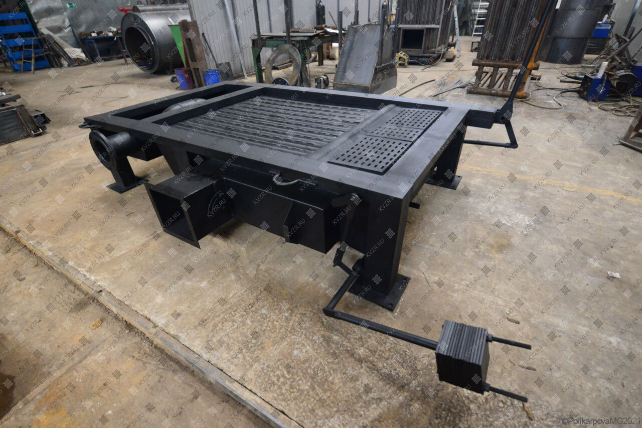 В топку водогрейного котла топливо подается ручным способом через загрузочную дверцу котельного блока и сжигается на слоевой топке, под которую вентилятором подается воздух для горения. Поворотные колосники набираются в колосниковую решетку из отдельных секций, каждая из которых закрепляется на общем валу.
