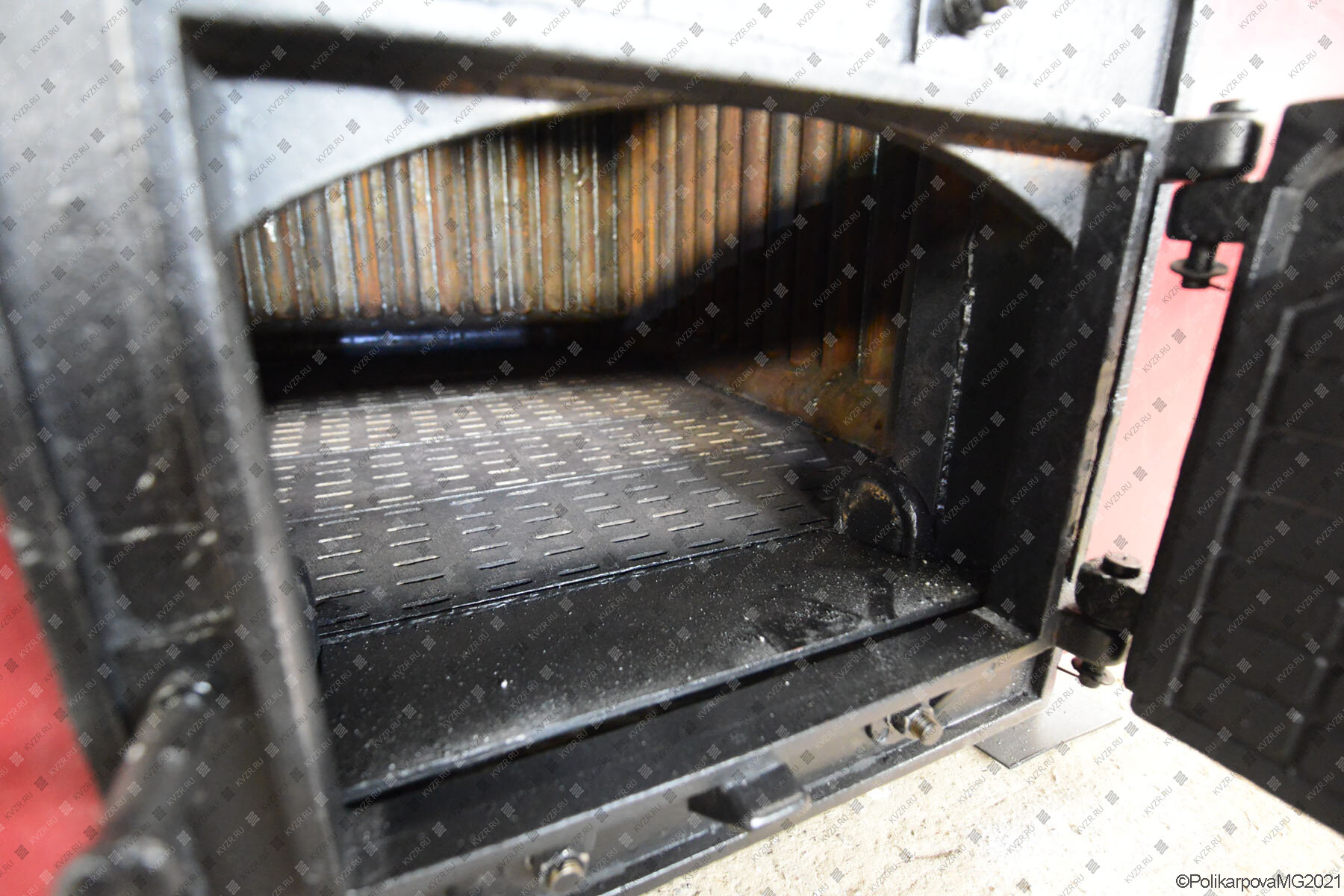 Горение топлива осуществляется на колосниковой решетке из чугуна со специальными отверстиями для золы. Зола, проваливаясь сквозь эти отверстия, подпадает в короб. Еще один такой короб располагается под конвективной частью. Для рациональной загрузки топлива фронтовая плита оснащается двумя загрузочными дверцами, расположенными друг под другом. Также для облегчения загрузки большего количества топлива топка выполняется в увеличенном размере, что способствует и лучшему сгоранию мелких и летучих частиц.