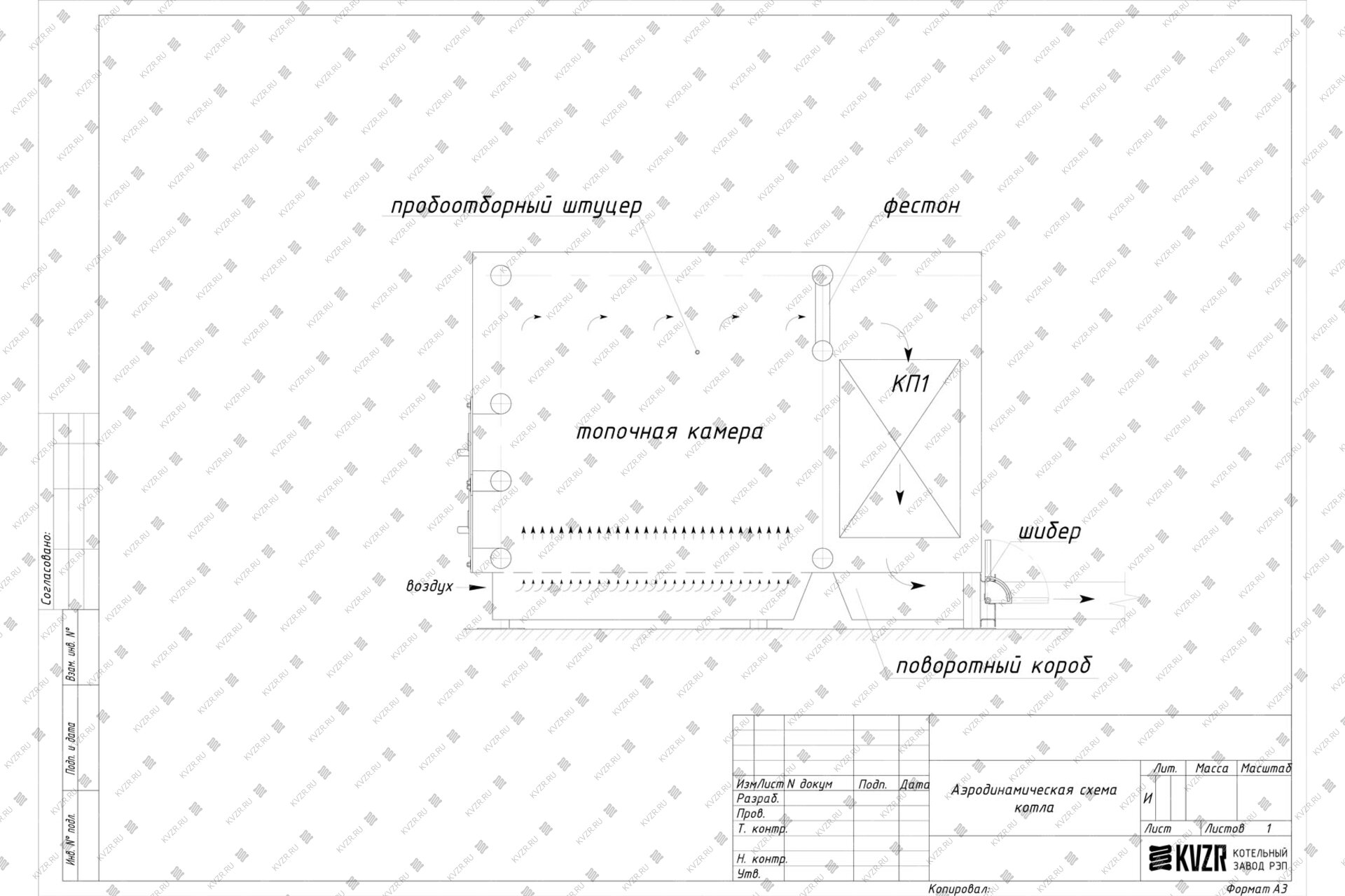 2. Горение: Воздух на горение твердого топлива подается принудительно дутьевым вентилятором. Интенсивность горения регулируется шибером на воздуховоде.